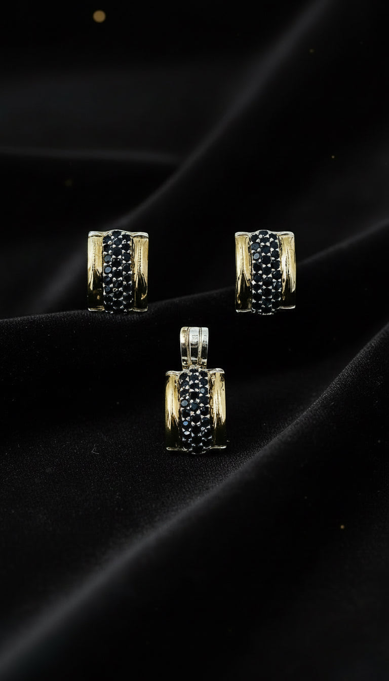 Juego de pendientes con colgante, color negro, pendientes cierre omega, plata 925 con oro 10Kl.